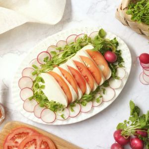 摆盘,豆苗垫底,一片豆腐一片西红柿穿插摆放,四周摆上樱桃萝卜片。