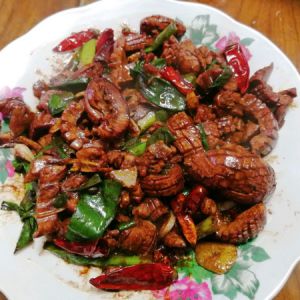 猪腰横切两半去掉中间白色部分,把猪腰表面划十字花刀后切成1厘米的花,准备好葱、姜、蒜、干辣椒。