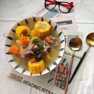 准备食材,排骨玉米洗净,胡萝卜削皮,生姜切片