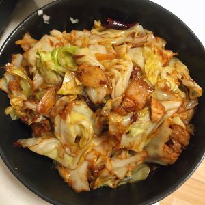 倒入包菜翻炒(四五成熟的时候倒入少许白醋防止包菜炒软,我喜欢吃脆一点的)