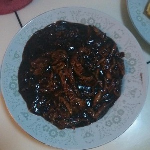 锅中重新倒入油,放少许姜末炒出香味,然后倒入蒸好的甜面酱,加入少许酱油,再倒入肉丝一起翻炒。待所有肉丝都均匀的裹上酱汁时,即可盛出装盘