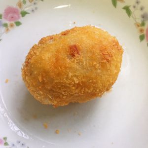 土豆压扁加芝士碎,在压一层土豆用力团成圆。