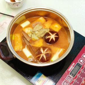 将熬制好的番茄汁;炸好的豆腐,香菇,姜蒜葱一起放入锅内,加入适量的盐,胡椒粉,香叶3片,桂皮少许,适量的糖(花椒大料可以选择性放,我不太爱吃所以没有放,调料根据个人口味适当放入,盐尽量选择0添加的盐)