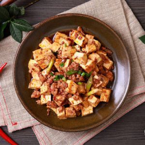 取一只大而且深的盘子,放入豆腐,上面再均匀地平铺肉末,把调好的酱汁浇在豆腐表面,撒上花椒粒和蒜苗段,加盖留孔放入微波炉底盘,微波高火烹饪5分30秒。
