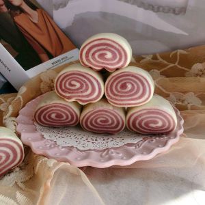 白色面团:150克的自发粉加入15白糖牛奶和成光滑面团,紫薯面团:150克的自发粉加15克的紫薯粉15的白糖,牛奶和成紫薯面团。(牛奶一点点加,不可一次全下)。