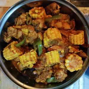 在煮鸡块的时候,准备其他的备料。土豆切块儿,玉米切段儿,青椒斜刀切段儿,大姜片儿和葱段。中间那个八角等,超市买的大盘鸡五香料,酱料包