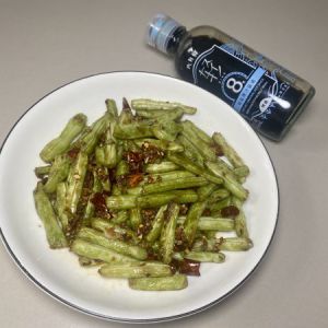 下四季豆加入糖、六月鲜 8克轻盐特级原汁酱油、盐(可放可不放)翻炒均匀即可出锅