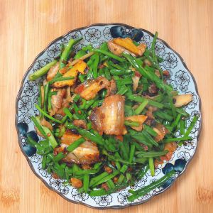 最后加入切好的韭菜翻炒、起锅前放适量盐、少量白糖提鲜,即可盛盘。