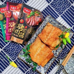 加入大喜大孜然味烤肉酱,戴上手套给三文鱼骨按摩一下。