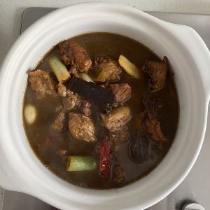 我喜欢用砂锅来炖,汤汁只有一半时加入盐调味,也可以加入你们喜欢的食材(土豆、胡萝卜等)等着收汁!