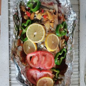 然后就可以弄个锡纸,把鱼包上,防止汁水淌出来,放几片柿子,或者家里有圆葱,或者青椒,都可以,简单配点。放进烤箱,180度,上下火,30分钟,哈哈,美美哒,香香哒!