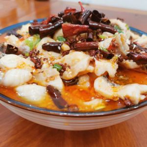 热腾腾干辣椒和花椒倒进装满配菜和鱼片鱼骨锅中,水煮鱼就完成了。