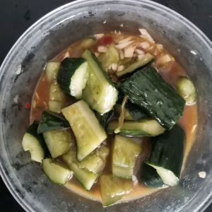 最后也是关键的一步,用九牛二虎之力把黄瓜和酱汁摇匀,让黄瓜更好的吸收酱汁成品,放冰箱冰一下,个人觉得冷的沙拉醋更好吃