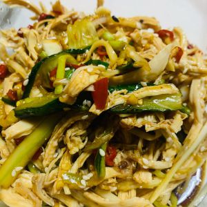 准备食材:鸡脯肉一块、大蒜、黄瓜、小米椒、葱花大葱丝。
