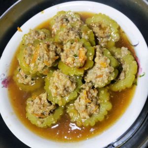 把肉馅塞好摆盘,上蒸锅蒸二十分钟左右至苦瓜熟