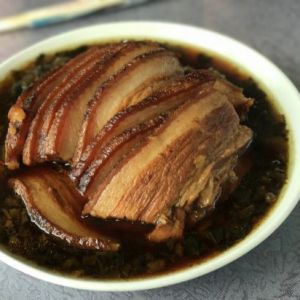 将蒸好的梅菜扣肉取出来,在面上覆盖一个盘子,双手按住上下碗盘,迅速将盘子翻个面,梅菜扣肉就反扣在了盘中,一碗美味的梅菜扣肉就做好了