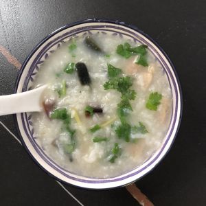 等粥煮快熟了,在放皮蛋和肉。一直搅拌。肉熟了就可以放香菜了