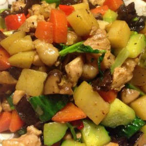 加入胡萝卜和土豆丁,翻炒,加酱油,至七八成熟