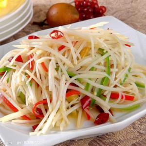 炒锅上火,加入花生油烧热,放葱丝爆锅,加入干辣椒炒香,再加入青红椒丝、土豆丝,炒至八成熟时加入精盐、味精调 味,再淋上香油和香醋,炒熟即可。