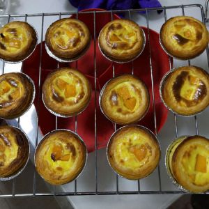 蛋挞皮摆好放上芒果粒,倒入适量调好的蛋液
