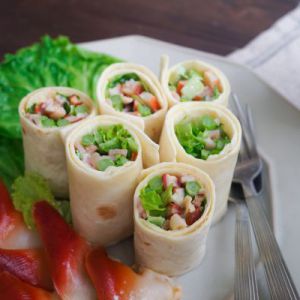 将饼皮放在煎锅上微热,然后把生菜培根、北极贝和芦笋铺在饼皮上,淋上色拉酱。