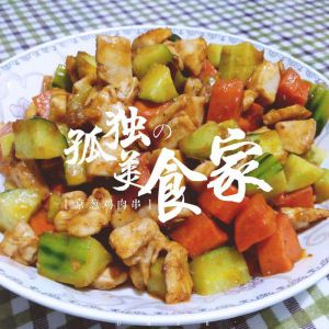 加入胡萝卜,黄瓜,鸡丁翻炒,调入适量咸盐,翻炒至熟后方可装盘!