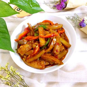 放茄子翻炒,少量多次加水翻炒4-5分钟左右