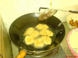 下油锅了,刚下锅要让它先炸一下,别动它,炸硬一点了,再翻身