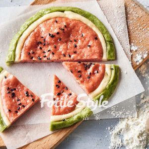 白色、绿色面团均搓成细条;将白色细条包围住红色面皮
