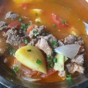 炒好以后倒入之前备好的的牛肉汤里,加入土豆,适量生抽,然后全部材料一起继续炖,炖大概30分钟,直到番茄炖化了,牛肉土豆都炖烂了,就可以了。