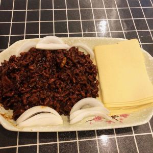 热油放入葱花翻炒,倒入炒熟的肉,调好酱汁,甜面酱生抽白糖,倒入翻炒,收汁