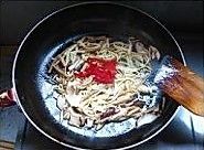 锅中座油,下抄过的蘑菇、香菇、笋干丝到锅中炒熟。
