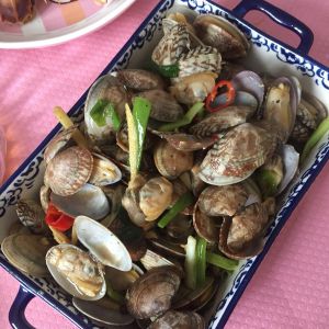 热锅加花生油,油热下红绿辣椒,蒜瓣和花椒,炒香