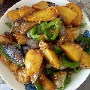 准备好材料,土豆、茄子切滚刀,青椒切大片,姜蒜切末日。