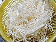 金针菇去根洗干净,红椒切丝,小芹菜切断,姜切丝,蒜切片。