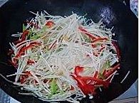 放入小芹菜断翻炒,七成熟时放入金针菇和红椒丝翻炒,加入盐调味,翻炒熟后即可出锅。