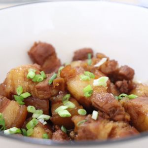 冷油放入冰糖,小火炒糖色(一定要小火,否则容易炒糊,红烧肉会有苦味),待冰糖全化、变成微褐色以后加入沥水后的肉块翻炒几下。