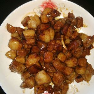 放入五花肉翻炒2 分钟左右,然后放入(酱油,生抽,盐,,加水没mò至五花肉) 小火盖盖炖5分钟左右,掀盖小火收汁