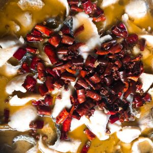 煮好的黑鱼放入盆内,如果家有大小合适的锅也可以直接用汤锅煮。煮好的鱼放入煎好的干辣椒和花椒