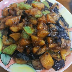 最后一步,锅中倒少量油葱姜蒜末炝锅,倒入之前切好的辣椒翻炒两下继续倒入炸好的茄子和土豆不断翻炒,最后放入一点生抽,甜面酱和食用盐 出锅~