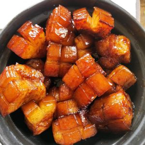 捞出肉块,清水洗净放凉,肉皮切十字花刀