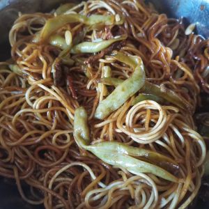 将扁豆覆盖在上面,翻炒至扁豆变色