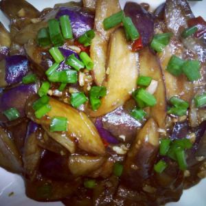开火,锅中放油,油热,倒入茄子,翻炒至有些软,倒入调好的料汁,炒几下收汁,撒把葱花,出锅。