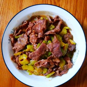 洗干净炒锅,热锅倒油,放苦瓜大火快炒至断生。然后再倒入牛肉翻炒两三下,立马盖上锅盖关火再焖5分钟。不着急吃的,焖久一点也可以。