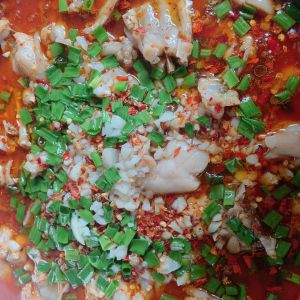 煮好的牛蛙倒入前面煮好的菜中、上面撒上细蒜末,辣椒和花椒、葱花,把烧热好的热油淋上去。
