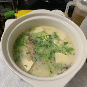 把煎好的鲫鱼放入砂锅,加入热水,大火炖煮5分钟,在加入豆腐中火炖煮10-15分钟,炖煮好起锅时加入适量的盐、胡椒粉、小芹菜即可。