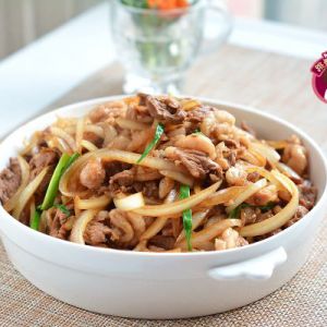 炒锅中倒适量油,油温7、8成时,将洋葱丝入锅翻炒2分钟,洋葱边上有微黄但是整体还是脆的时候盛出备用;