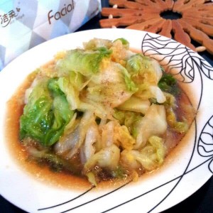 油锅烧热,放两片生姜爆油锅,下包菜,快速翻炒,变色后加盐,一勺糖,两勺酱油,翻炒后盖锅盖闷一下,起锅前加味精撒点胡椒(孜然)