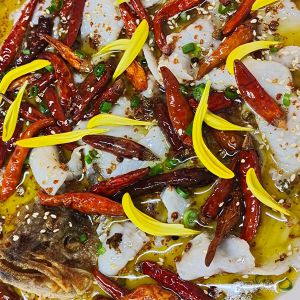 鱼骨下锅煎至金黄下两勺水煮成奶白色倒出。热锅下油放酸菜姜炒香下鱼汤煮开倒入碗,起火烧水,水滚下鱼片烫10秒倒出摆入碗中,热锅下油,花椒蒜泥辣椒下入爆香,淋到鱼片上就完成