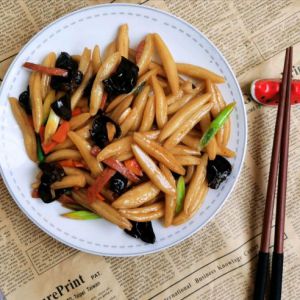 准备食材,面疙瘩买的是现成的,火腿、青蒜、木耳、胡萝卜切丝切片,大蒜切末。